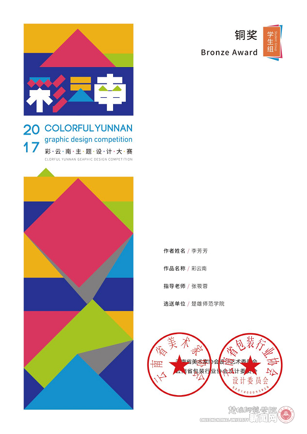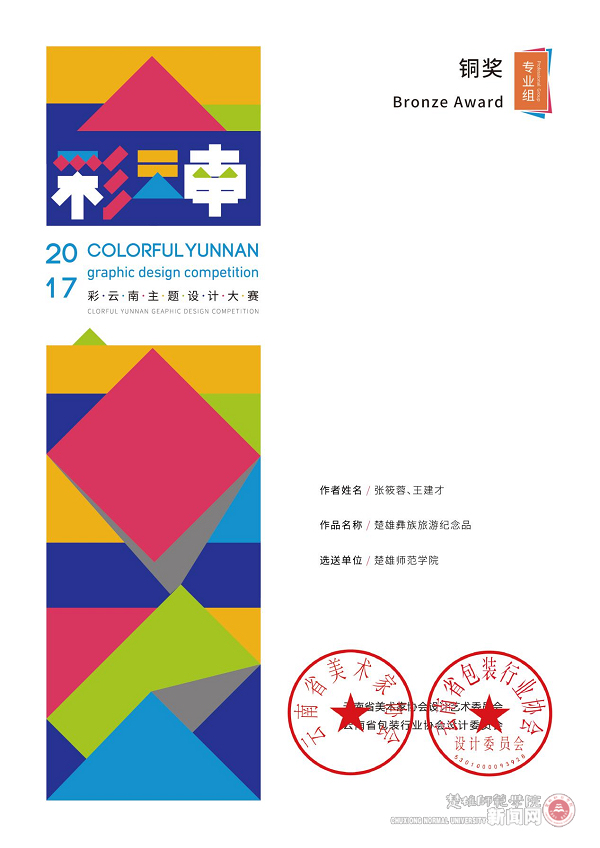 在2017年第三届“彩云南”主题设计大赛中,6165cc金沙总站检测中心高度重视,精心组织,经师生努力,获产品设计类专业组铜奖2项,学生组空间设计类铜奖2项、视觉传达设计类铜奖2项,学生组空间设计类入选1组、视觉传达设计类2组,此外,6165cc金沙总站检测中心还荣获该届赛事的“优秀组织奖”。