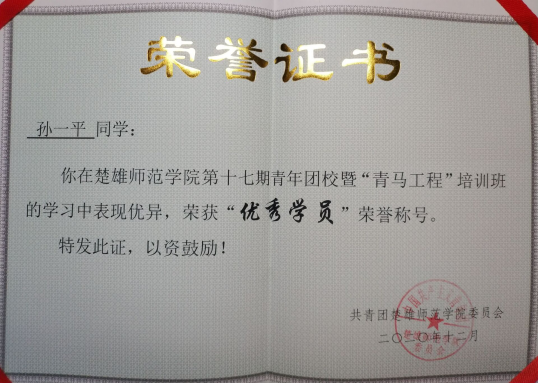 按照培训要求,参训学员分别撰写心得体会,学校于2020年12月2日下午举行了培训结业会,我院孙一平同学荣获 “优秀学员”荣誉称号。她表示此次培训收获颇多,作为一名学生社团干部,在平的日常生活中要学会团结同学,如何更好的和同学们沟通,多听取同学们的意见,讲求民主,为整个班级及学院做出自己的一份贡献,将自身的激情传播和散发给身边的每一个人,让自己身边的人也成为“青马人”。